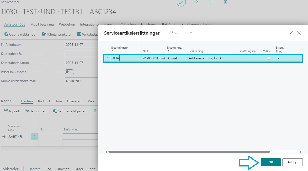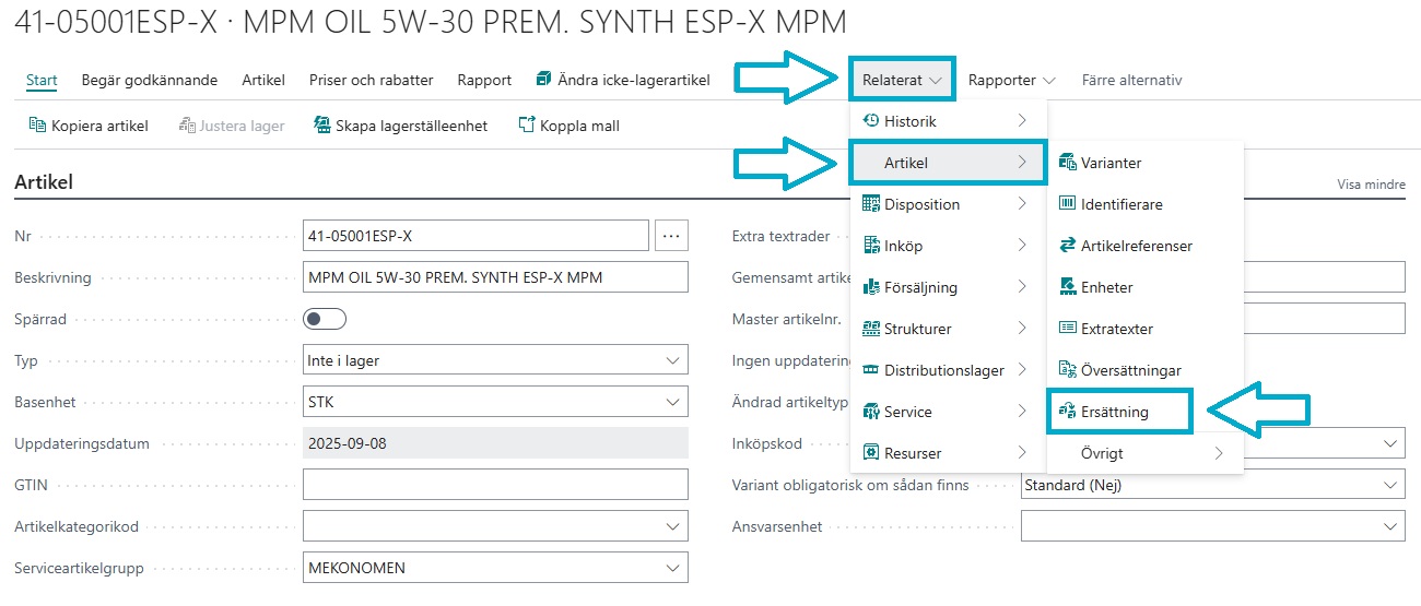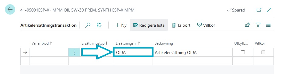 - Välj den artikel som du önskar ersätta till under fältet Ersättningsnr