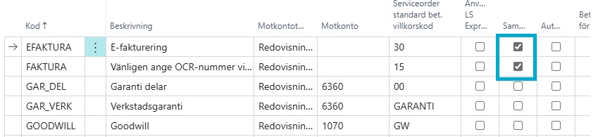 Bocka i rutan under “Samlingsfaktura” på det betalsättet som gäller för samlingsfakturering. Normalt är det betalsättet Faktura och E-faktura som fungerar.