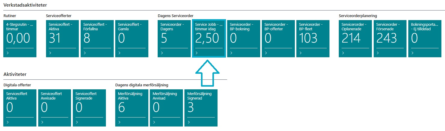 Från rollcenter → Verkstadsaktiviteter → Gå till Service Jobb timmar idag