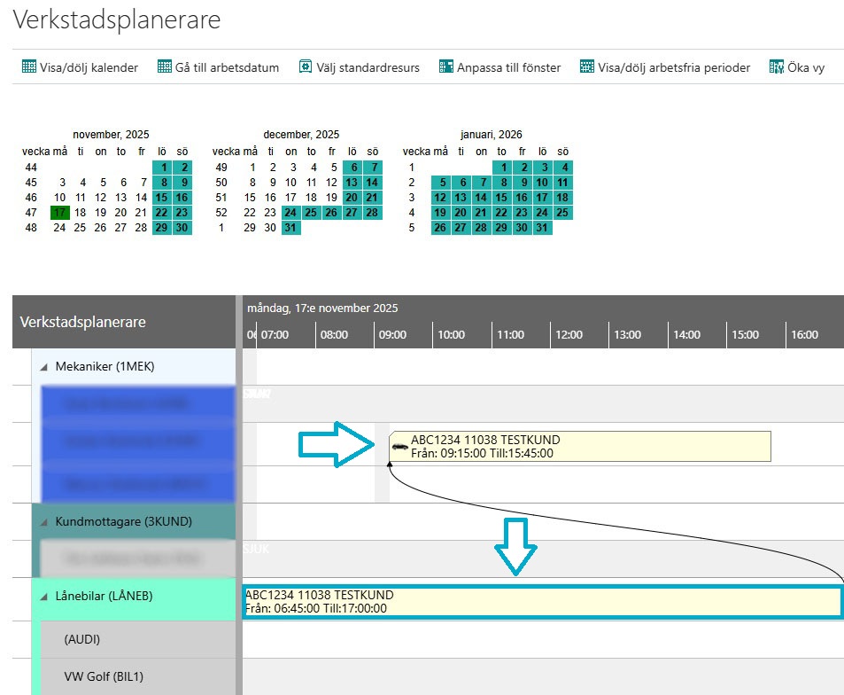 När ni nu planerar ut er order i verkstadsplaneraren kommer en rad att dyka upp under gruppen Lånebilar, här drar ni nu ut den allokerade raden på bilen kunden ska ha för dagen.