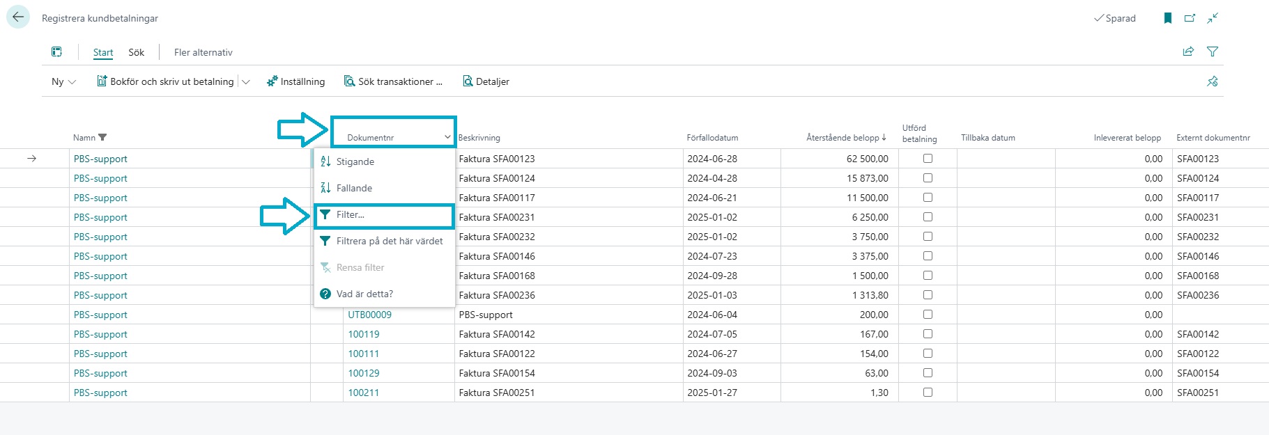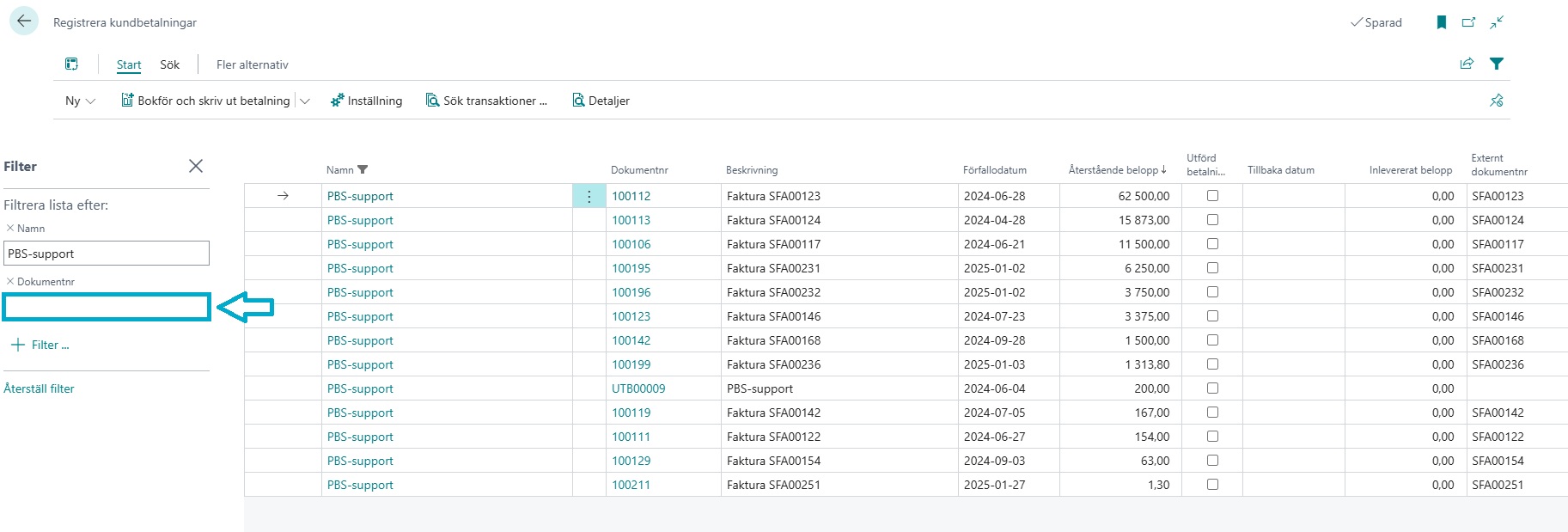 När ni har satt en faktura som betald, töm filtret genom att sudda ut numret i Dokumentnr och klicka på Enter.