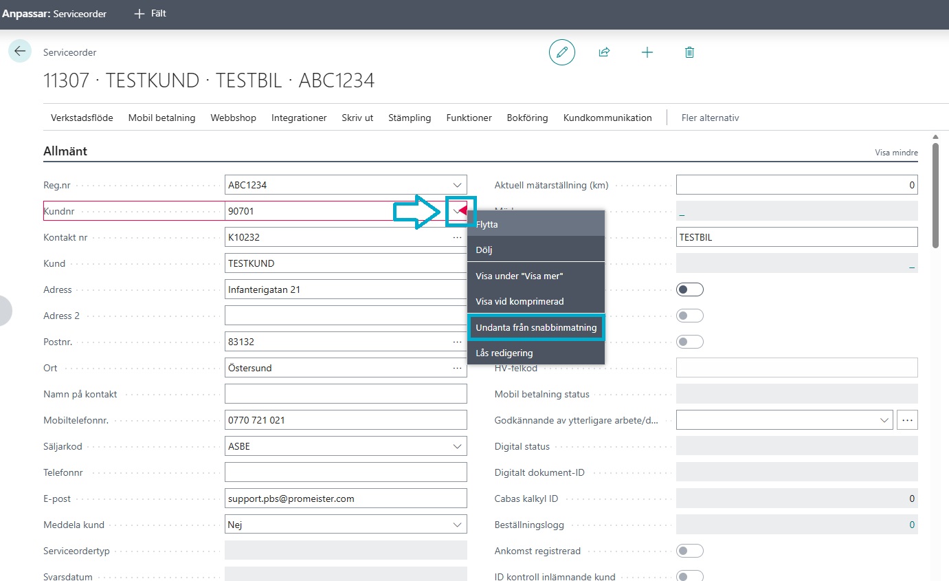 Visa hur man undantar fält för snabbinmatning från serviceorder och serviceoffert.